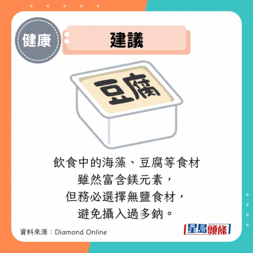 此外,還可以選擇無調味堅果,因富含鎂、鉀等礦物質,具有穩定血壓的功效。值得注意的是,海藻、豆腐等食材雖然也富含鎂元素,但務必注意沒有額外添加鹽,避免攝入過多鈉。