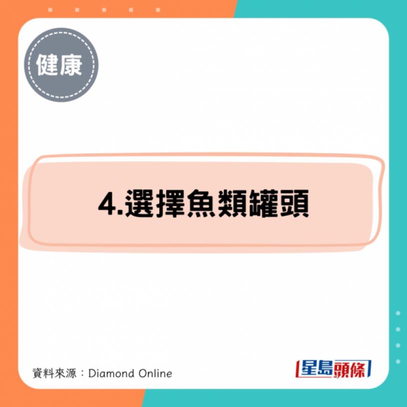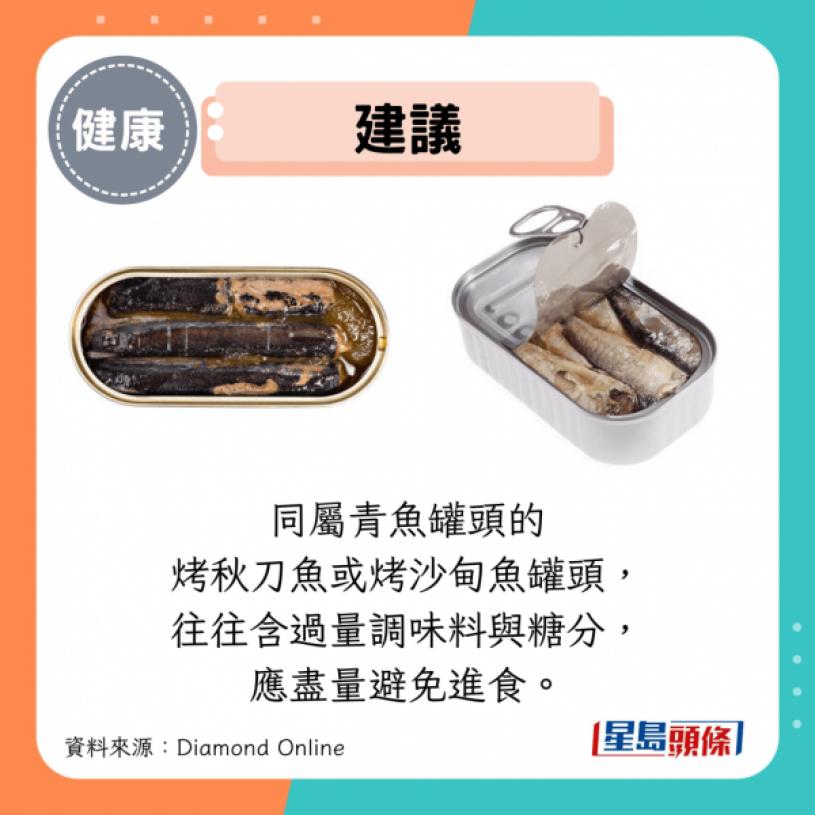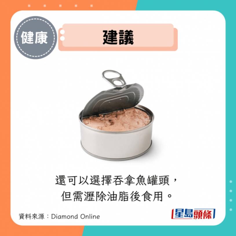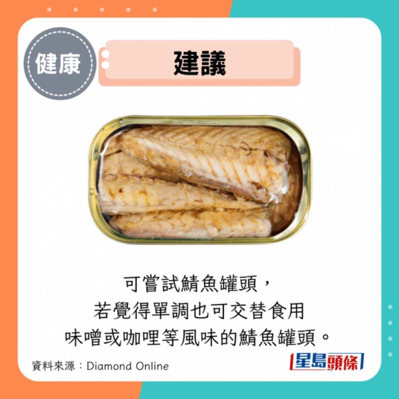 鯖魚罐頭不用額外處理,可直接用來烹調,吞拿魚罐頭也是不錯的選擇,但需瀝除油脂後食用。惟特別注意,烤秋刀魚或烤沙甸魚罐頭,往往含過量調味料與糖分,應盡量避免進食。