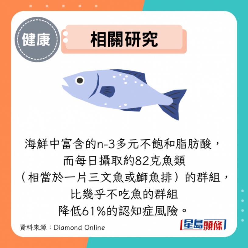 此外,有大型研究探討了海鮮中富含的Omega-3多元不飽和脂肪酸與認知障礙症的關係。每日攝取約82克魚類(相當於一片三文魚或鰤魚),比幾乎不吃魚者,認知障礙症發生風險降低61%。針對三酸甘油脂的改善效果,研究顯示每周食用3次鯖魚即可見效,甚至部分實驗證實每周吃1次就有調節作用。