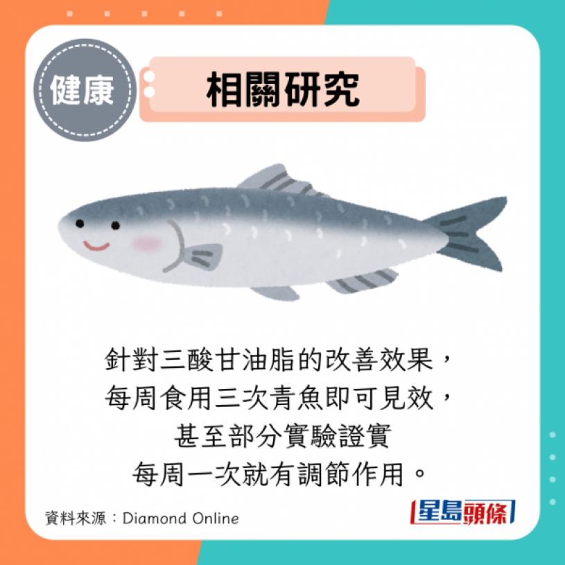 在眾多食材中,鯖魚、秋刀魚等青背魚好處最多。如果嫌處理鮮魚很麻煩,可嘗試鯖魚罐頭,若覺得味道單調也可交替食用味噌、咖哩等風味的鯖魚罐頭。大平哲也曾進行為期3周的實驗發現,完全戒除肉類並每日三餐攝取魚類,主要以生魚片和鯖魚罐頭為主,結果三酸甘油脂下降大約一半,血液黏稠度也明顯改善,但當恢復肉類飲食僅1周後數值就回復原狀,證實吃魚對健康的獨特好處。