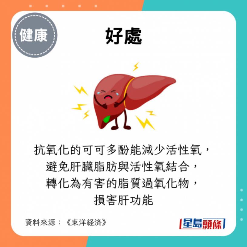 當肝臟脂肪與活性氧結合時,脂肪會轉化為有害的脂質過氧化物,損害肝功能。攝取具有強大的抗氧化的可可多酚,能夠減少活性氧,以預防並改善脂肪肝。此外,可可多酚還具有改善胰島素阻抗的效果,亦有助於防止脂肪肝的惡化。