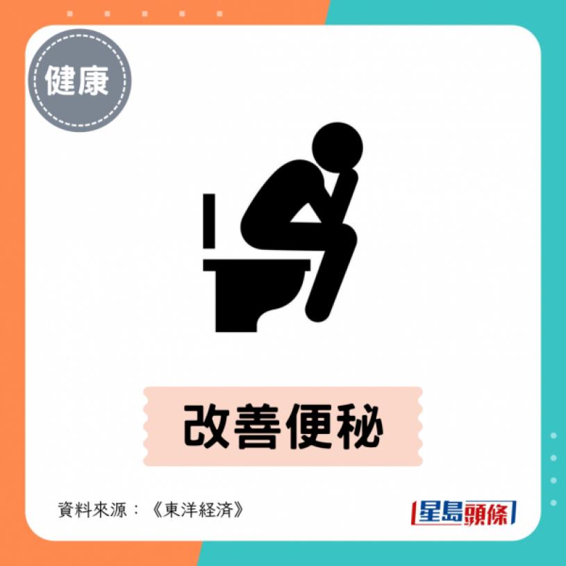 富含膳食纖維的可可有助緩解便秘。如果便秘持續,腸道環境惡化產生的毒素會進入血液,對負責解毒的肝臟造成沉重負擔。
