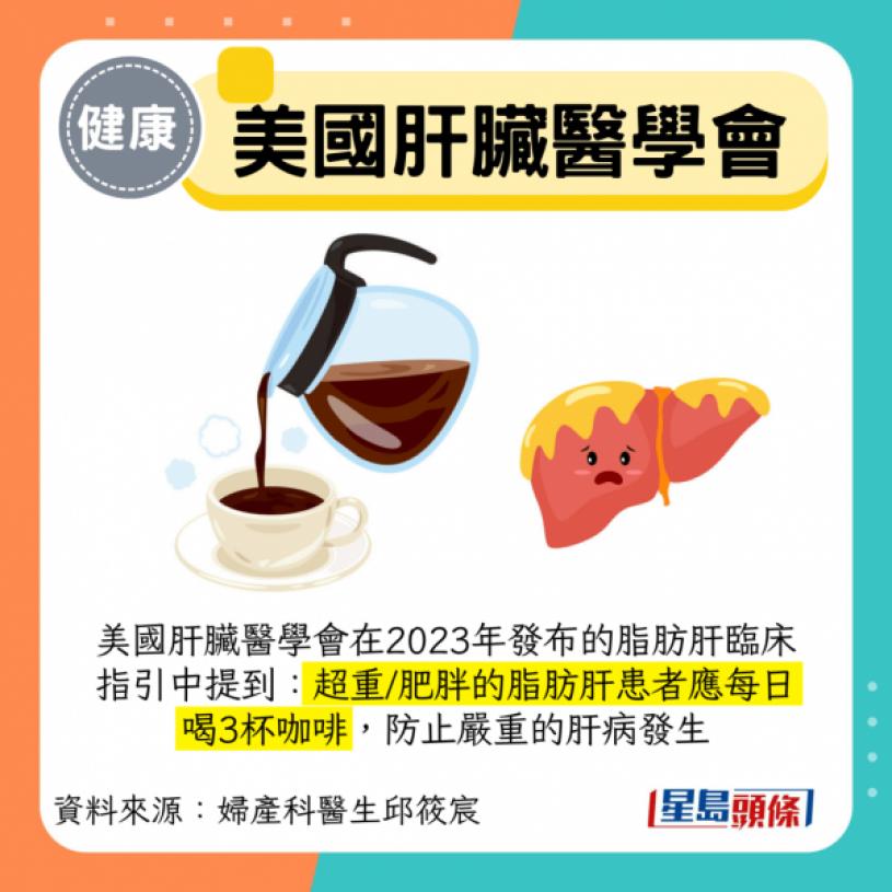 咖啡除護肝外,還有其他健康功效,每天最多喝幾多杯呢?邱醫生引述美國肝病學會基金會(AASLD)在2023年發布的脂肪肝臨床指引中提到:超重/肥胖的脂肪肝患者應每天喝3杯咖啡,預防嚴重心臟病的發生,或對糖尿病有潛在的好處: