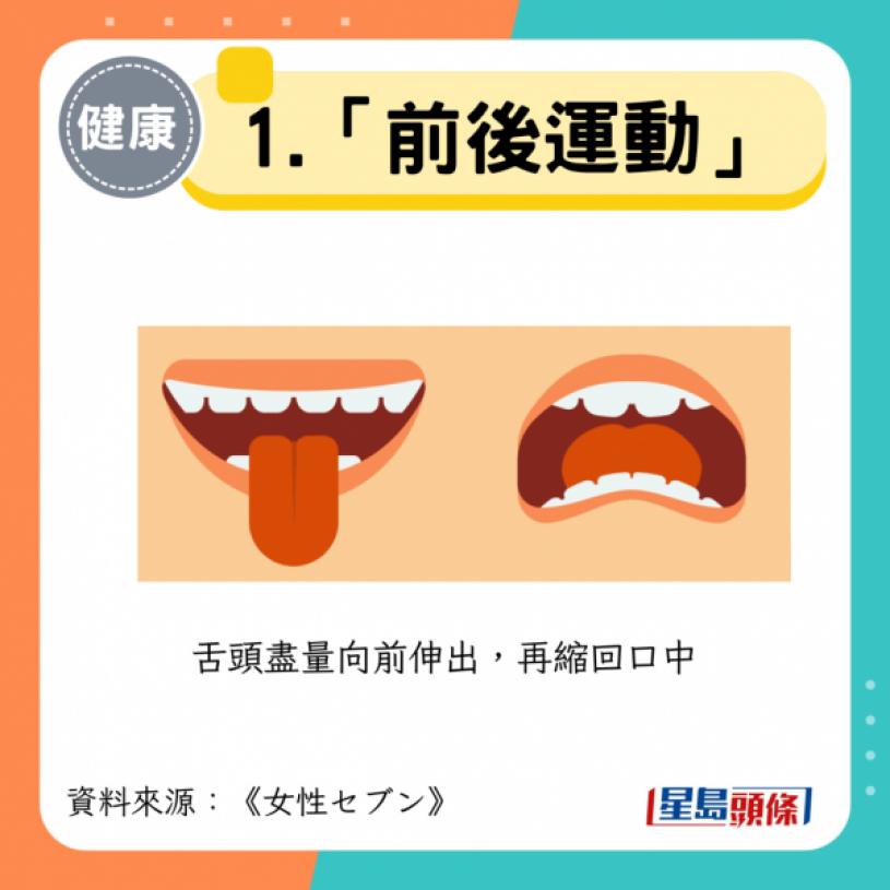 - 第1步「前後運動」:舌頭盡量向前伸出,再縮回口中。