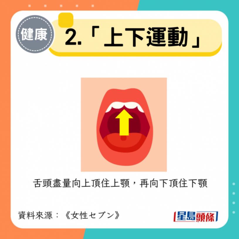 - 第2步「上下運動」:舌頭盡量向上頂住上顎,再向下頂住下顎。