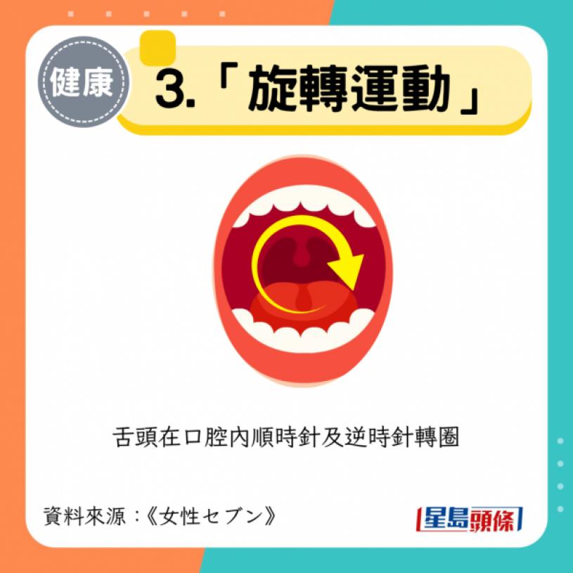 - 第3步「旋轉運動」:舌頭在口腔內順時針及逆時針轉圈。