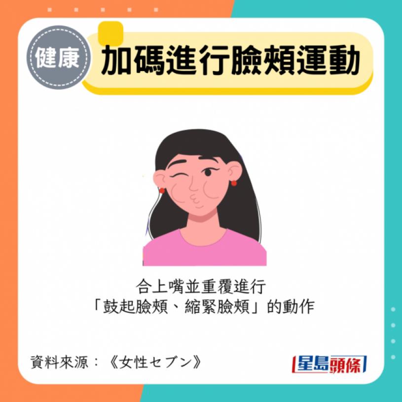 最後,可加碼進行「臉頰運動」,合上嘴並重覆進行「鼓起臉頰、縮緊臉頰」的動作,效果會更佳。