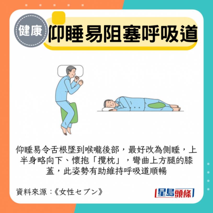 平躺著容易令舌根墜到喉嚨後部,阻塞呼吸道並引發呼吸暫停。白濱醫生推薦最好改為側睡(左右皆可),上半身略向下、懷抱「攬枕」,彎曲上方腿的膝蓋,此姿勢有助維持呼吸道順暢。