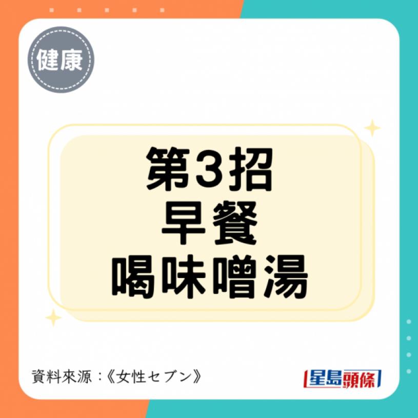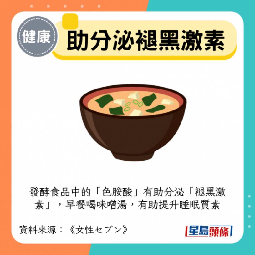 白濱醫生指,發酵食品中的「色胺酸」有助分泌「褪黑激素」,早餐喝味噌湯,有助提升睡眠質素。
