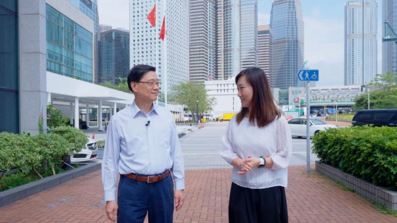 李家超與特首辦特別助理黃芷淵對談,說起上任三周年感受。(特首辦片段截圖)