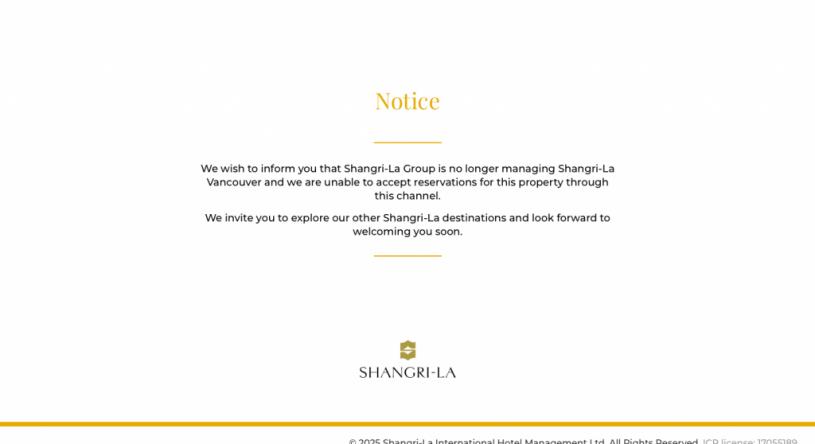 「我們謹此通知您,香格里拉集團(Shangri-La Group)不再管理溫哥華香格里拉酒店(Shangri-La Vancouver),我們將無法透過此渠接受該酒店的預訂。」