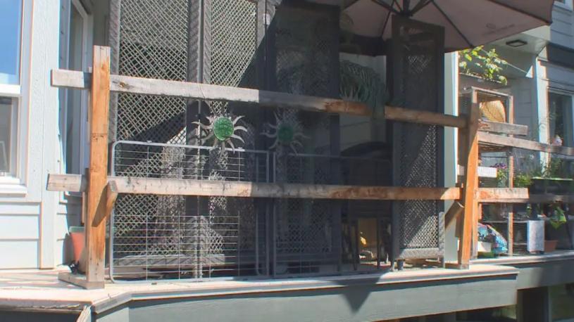 希施紧紧抓住一个用2x4木料搭建的临时阳台栏杆。她摇晃了一下,栏杆便明显晃动。“这不安全,”她说。