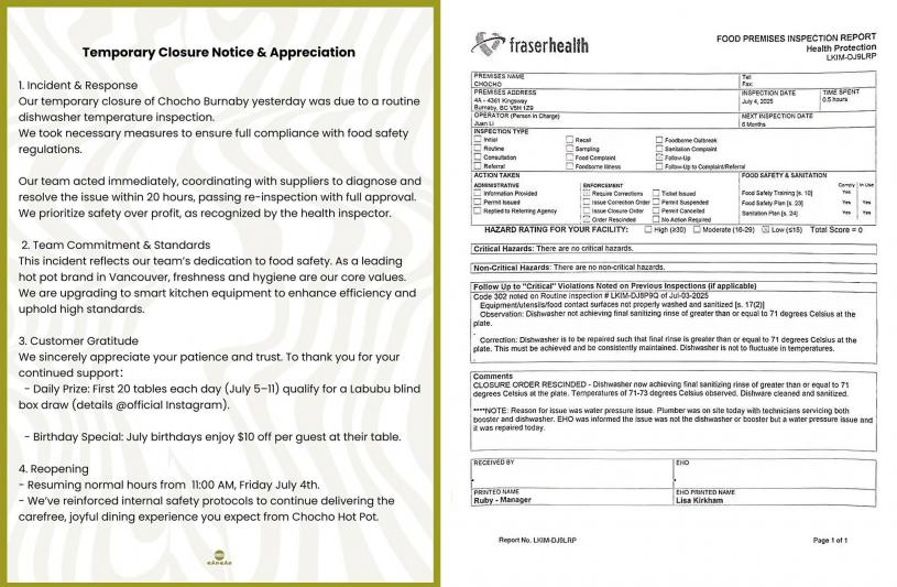 該家位於鐵道鎮附近的火鍋店翌日即在社交媒體上開誠布公,宣告解決了相關問題,目前已完全符合衛生局的要求,於周五 (4日) 上午11時起恢復營業,並貼出當局最新的檢查報告。
