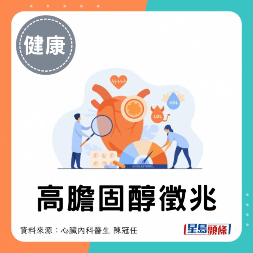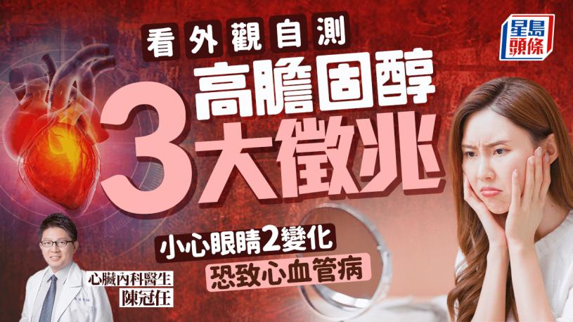 心臟內科醫生陳冠任在節目《健康雲之道》指,一般膽固醇過高的高血脂患者也無明顯疼痛不適症狀,往往要抽血檢查才可確診,但此時通常已延誤診斷。惟他指出,也可從肉眼分辨膽固醇是否超標,當外觀出現以下徵兆時則要特別留意。
