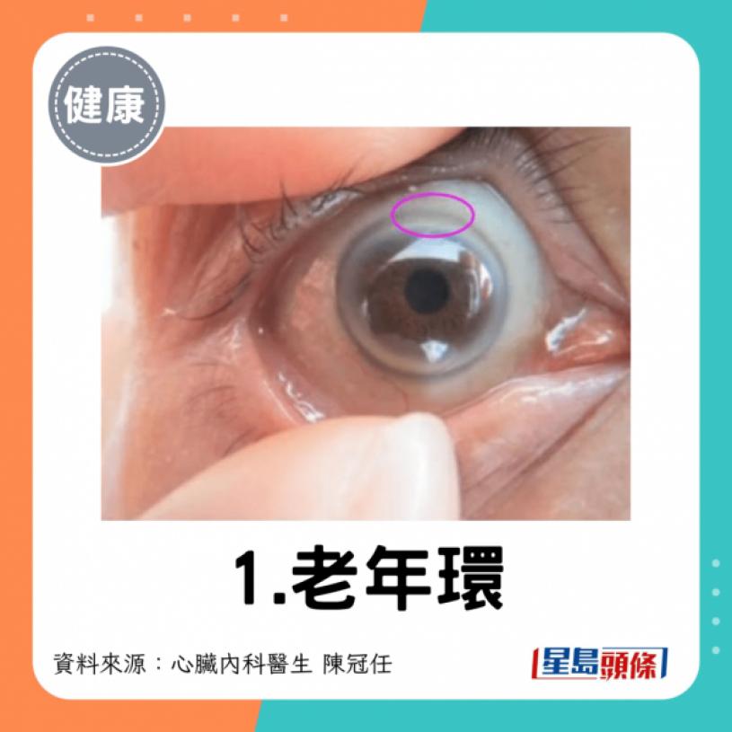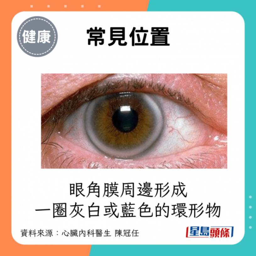 - 常見位置:眼角膜周邊形成一圈灰白或藍色的環形物