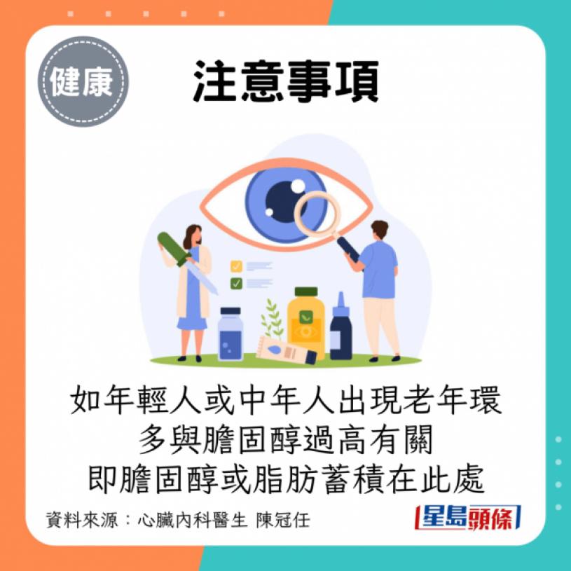 - 注意事項:如年輕人或中年人出現老年環,多與膽固醇過高有關,即膽固醇或脂肪蓄積在此處