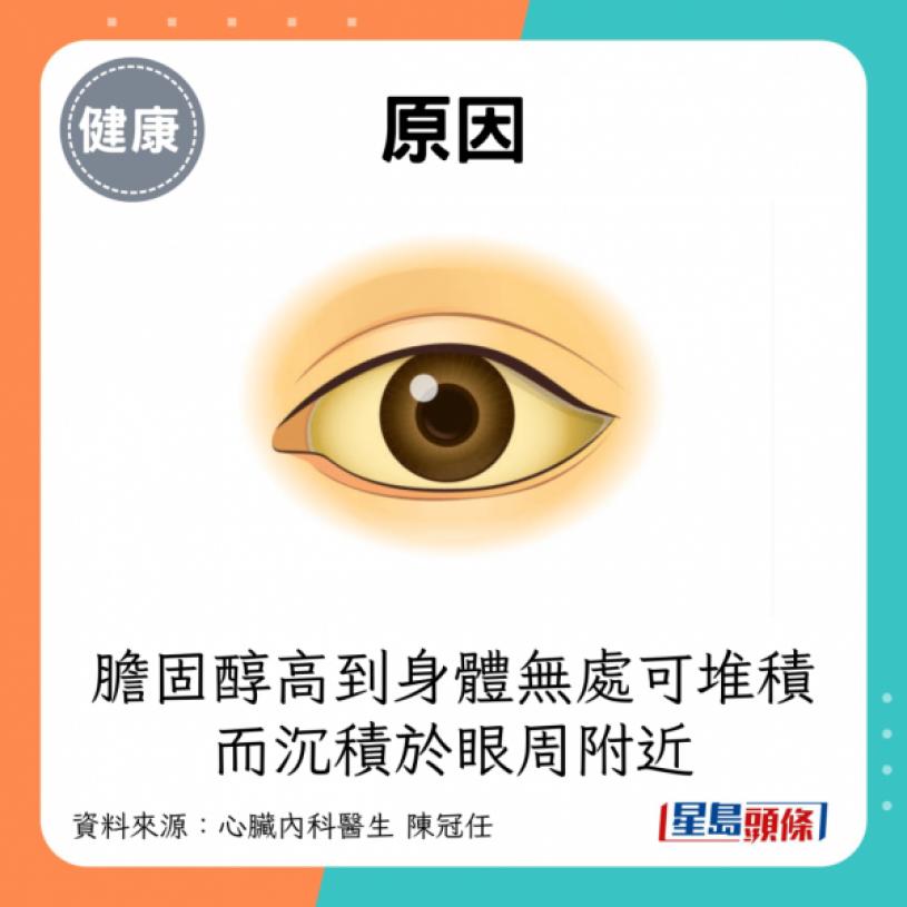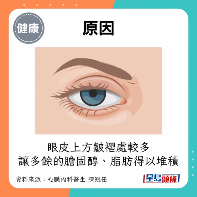 - 原因:膽固醇高到身體無處可堆積,而沉積於眼周附近。而且眼皮上方皺褶處較多,讓多餘的膽固醇、脂肪得以堆積。