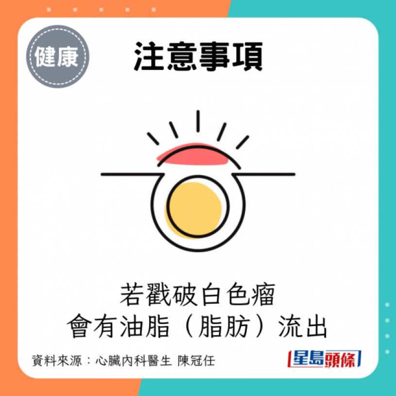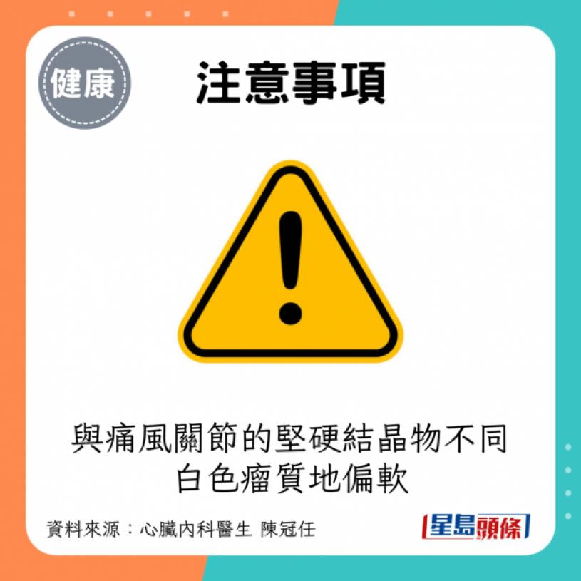 - 注意事項:若戳破白色瘤,會有油脂(脂肪)流出。如痛風關節的堅硬結晶物不同,白色瘤質地偏軟,有助分辨症狀屬尿酸過高或血脂過高。