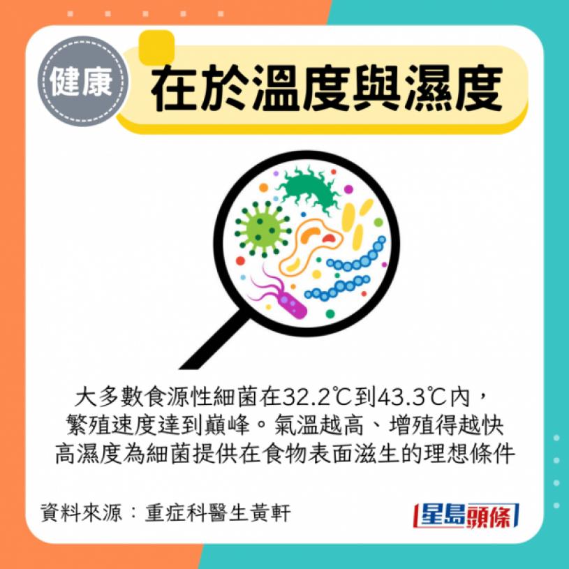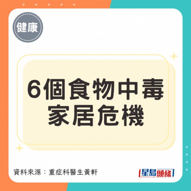 黃醫生指,令人驚訝的是,食物中毒發生率最高的場所是「家居」內;事關有不少家庭習慣將飯菜放在餐桌上,用罩子蓋住。其實,根據美國FDA指引,食物在室溫下不應放置超過2小時,若氣溫高於32℃、則應縮短至1小時,否則不建議再食用。黃醫生更指出了家中6個中伏危機: