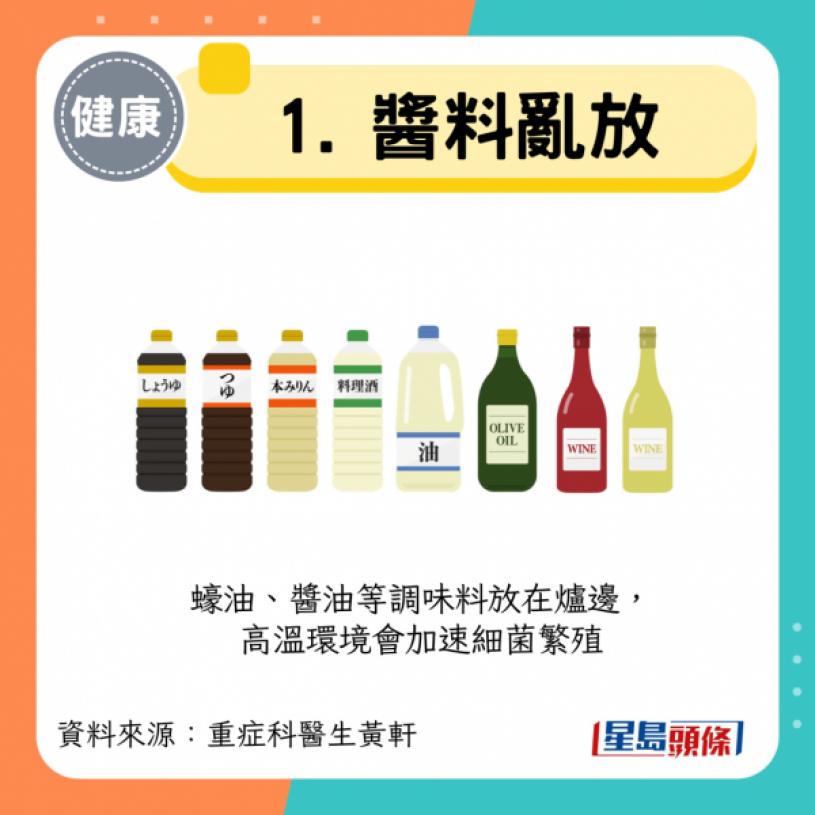 蠔油、醬油等調味料放在爐邊,高溫環境會加速細菌繁殖。