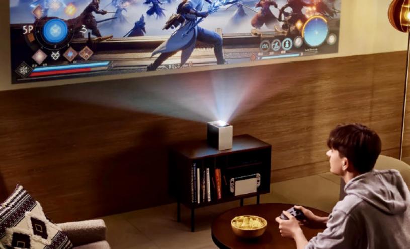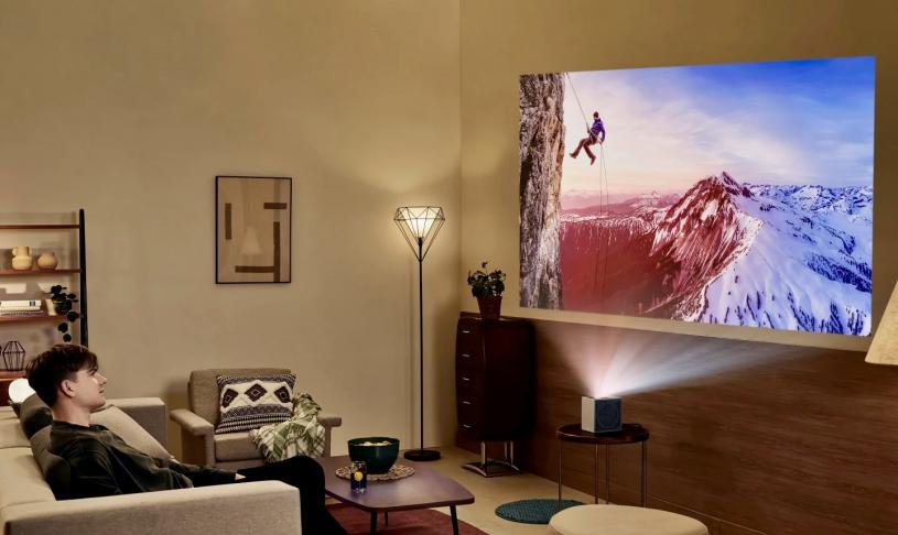 该影片似乎暗示此机种无需插电即可运作,但实际上它不含内建电池,会随机附赠 65W USB-C 变压器。插电后即可投影出最大片幅达 100 吋对角线的 4K UHD 影像,其 投射比为 0.25:1 —— 即机器只需距离垂直投影面 39.3 公分(15.5 英吋) 即可显示最大画面。