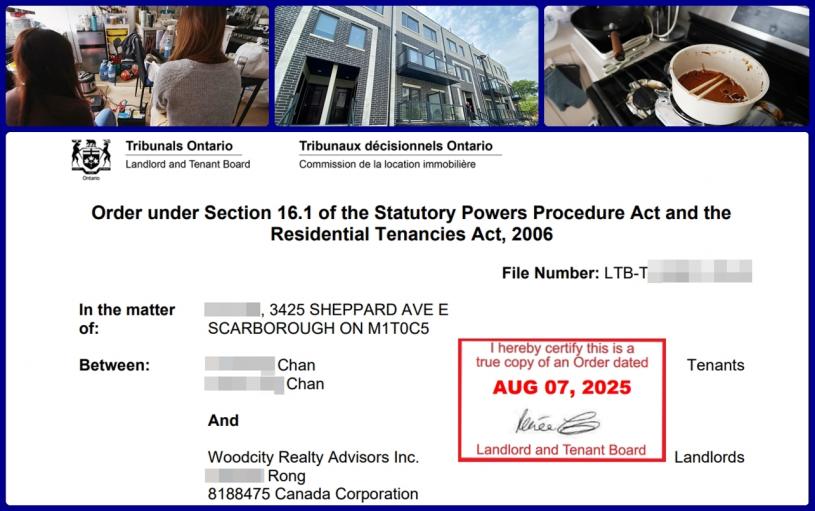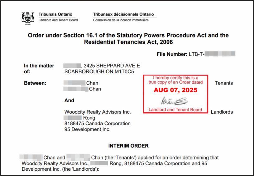 8月7日,安省业主和租客仲裁委员会(LTB)就案件发出一道临时命令(interim order),指相关业主涉嫌干扰租客单位的食水及电力供应,并阻碍租客进入单位。仲裁委员会要求拥有业权一方应即时恢复水电,并加快排期聆讯。