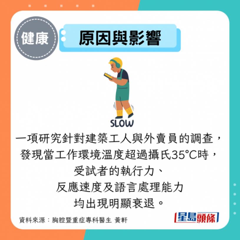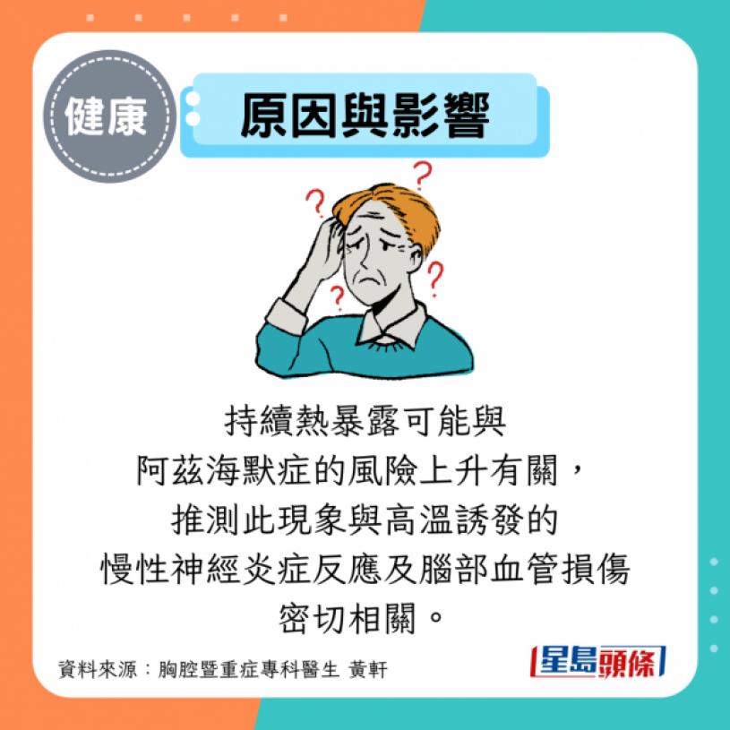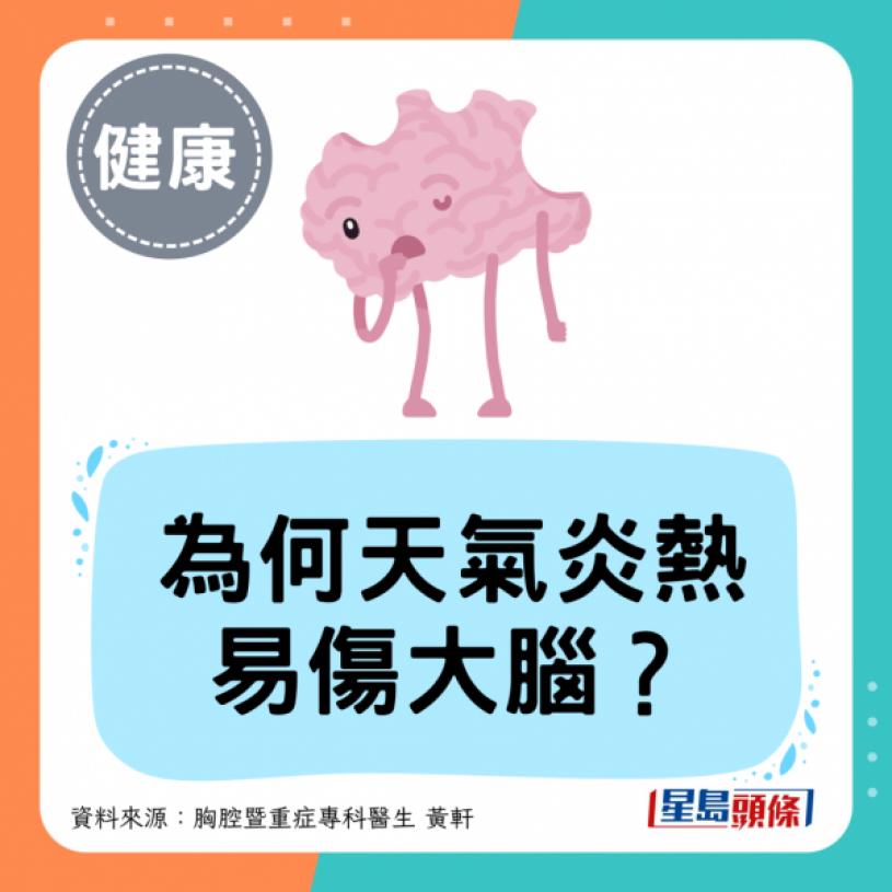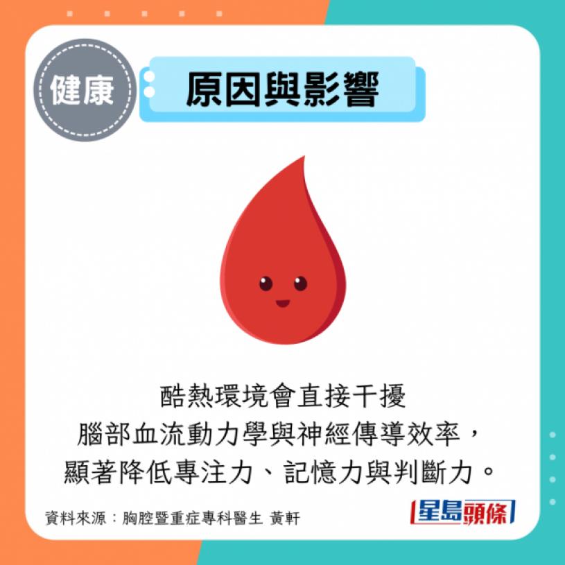 胸腔暨重症專科醫生黃軒在網頁上發文指,夏季持續攀升的高溫不僅大量出汗、頭暈目眩等不適症狀,更有機會令大腦受損。近年有科學研究證實,極端炎熱環境會直接干擾腦部血液循環、阻斷神經傳導功能並破壞腦內化學物質平衡,導致專注力顯下降、判斷能力減退及情緒控制失調等慢性傷害的風險。