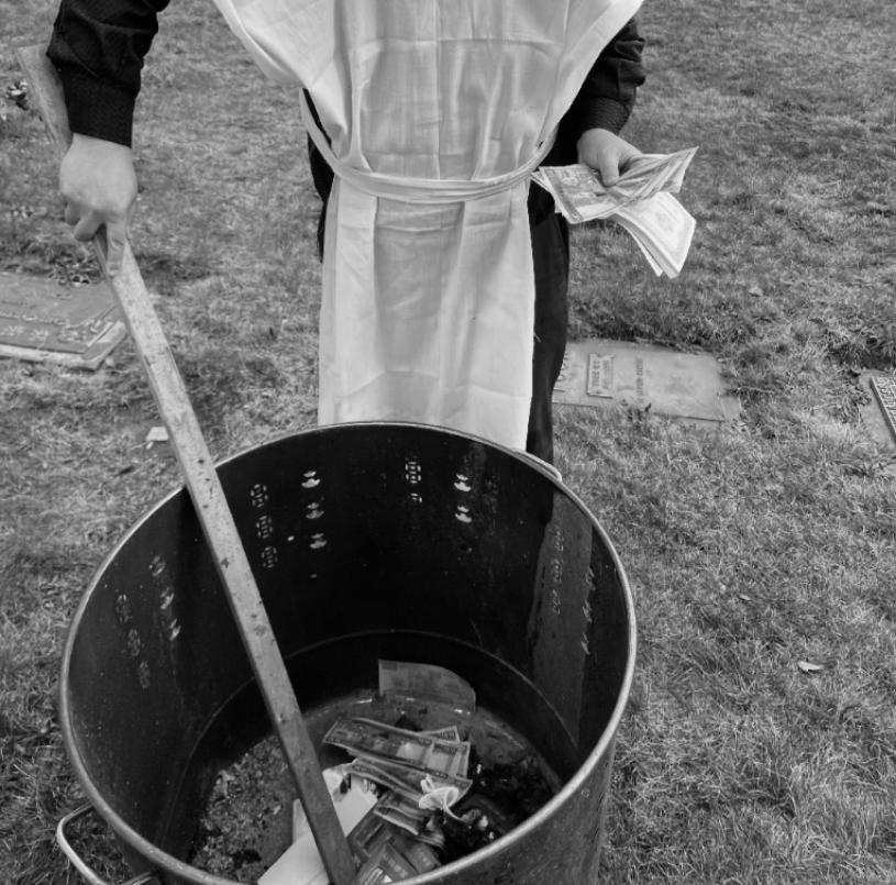 致祭前几天,我想到列治文观音寺门前查问,才发现原来寺院也不准善信自行烧化,只许购买早预备好的冥用纸袋,让僧徒代办。
