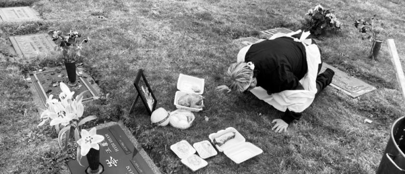 私祭的当天,我在车前贴上了“奠”字,才打着危险警告灯慢驶,沿途把加芙接上,让她抱着嫲嫲的遗照。