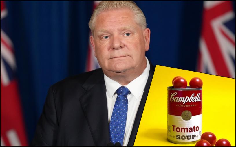 金宝汤(Campbell’s)多年来以广告口号“M’m, m’m, good”作招徕,但福特表示,自己至今仍见到金宝汤罐头标榜“加拿大食谱”,实际却在美国新泽西州生产,“你哋以为安省人咁蠢?我会拎罐汤出嚟撕掉标签,呼吁大家买安省制、加拿大制的汤”。