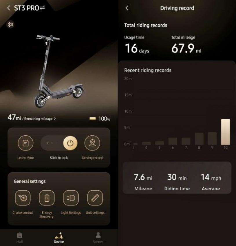 此外,ST3 Pro 的手機應用程式功能齊備,支援能量回收模式切換、巡航設定、行車紀錄等。唯一小缺憾,是目前只能腳踏滑行後才能啟動動力,但廠方表示九月更新將加入原地起步功能,屆時將更臻完美。