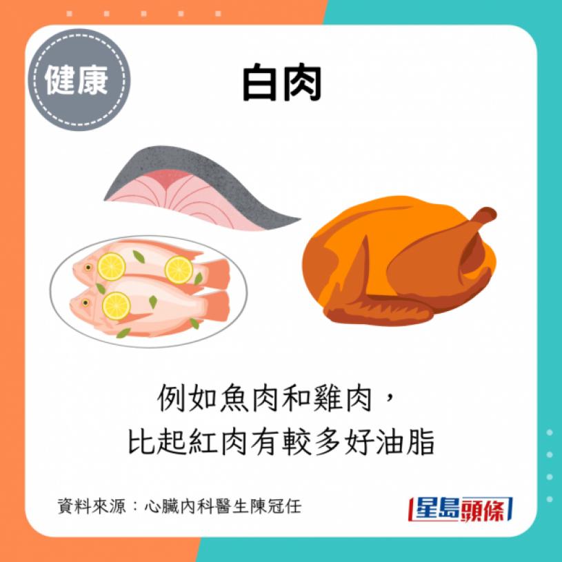 - 白肉:例如魚肉和雞肉,比起紅肉有較多好油脂。