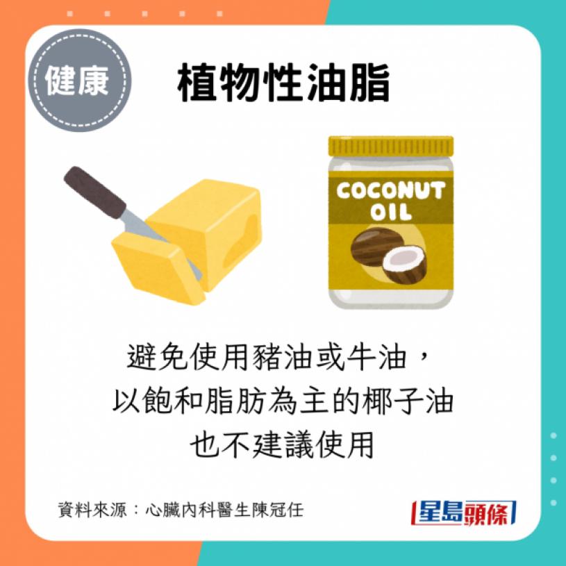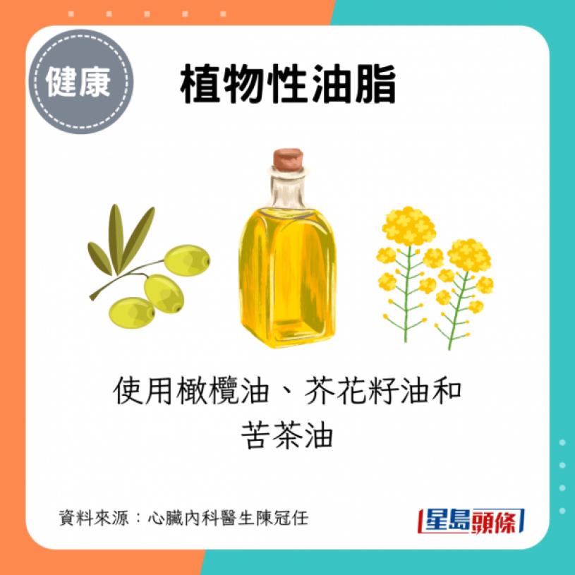 - 植物性油脂:使用橄欖油、芥花籽油和苦茶油,避免使用豬油或牛油,以飽和脂肪為主的椰子油也不建議使用。