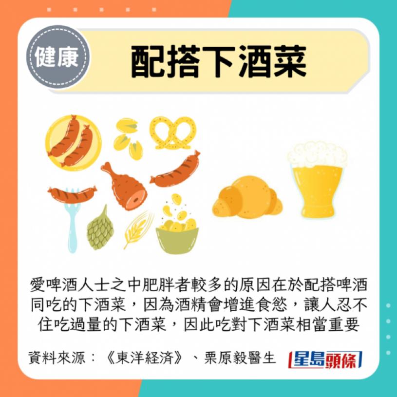 那麼為什麼愛啤酒人士之中肥胖者較多呢?原因在於配搭啤酒同吃的下酒菜,因為酒精會增進食慾,讓人忍不住吃過量的下酒菜,因此吃對下酒菜相當重要。對此,栗原醫生推薦以下相對健康的下酒菜,預防啤酒肚及脂肪肝: