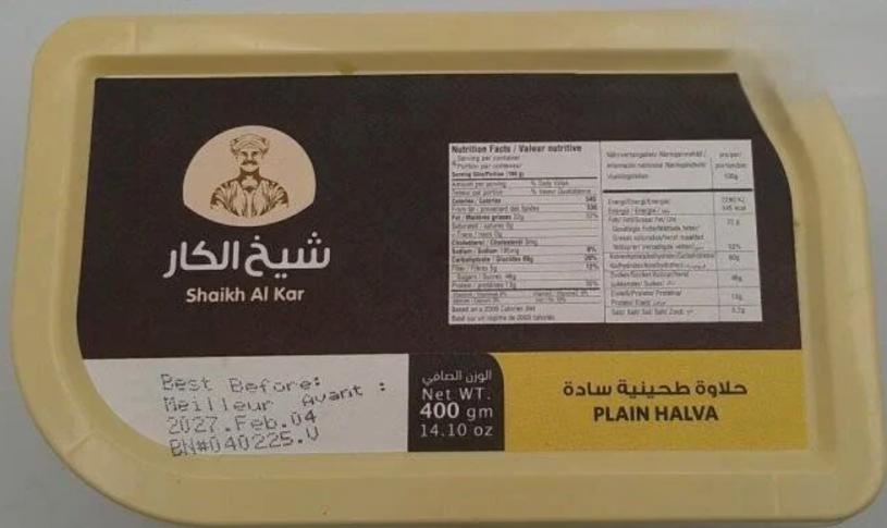 【星島綜合報道】加拿大食品檢驗局(CFIA)宣布,因沙門氏菌污染,全國多省正召回 Shaikh Al Kar 品牌產品原味哈爾瓦(Plain Halva)。雖然暫時未有個案與該產品直接相關,但當局提醒市民切勿食用、售賣或供應該批產品。