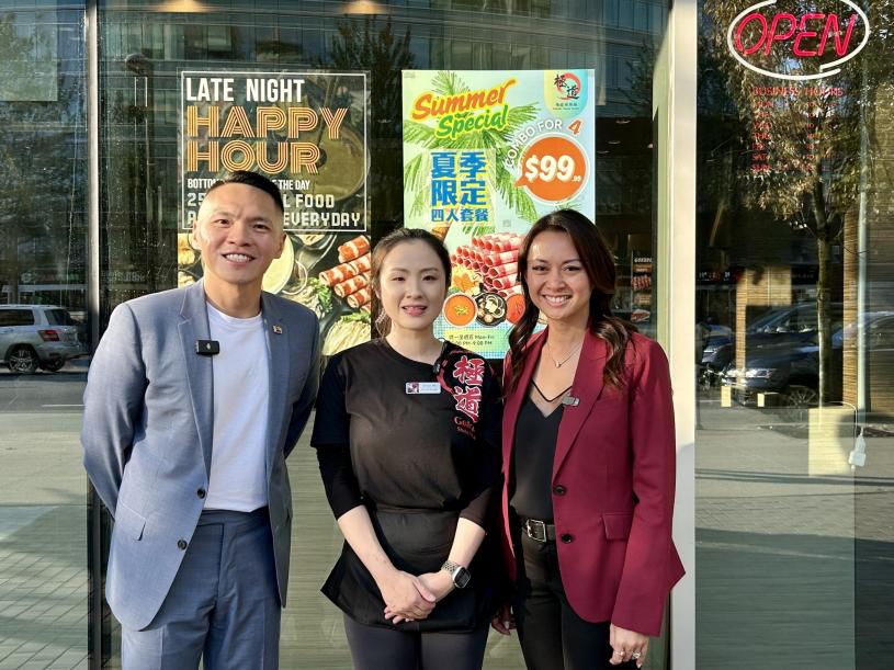 华尔迪(右)向民众喊话,在地消费支持卑诗小企业。星岛记者黄忆欣摄