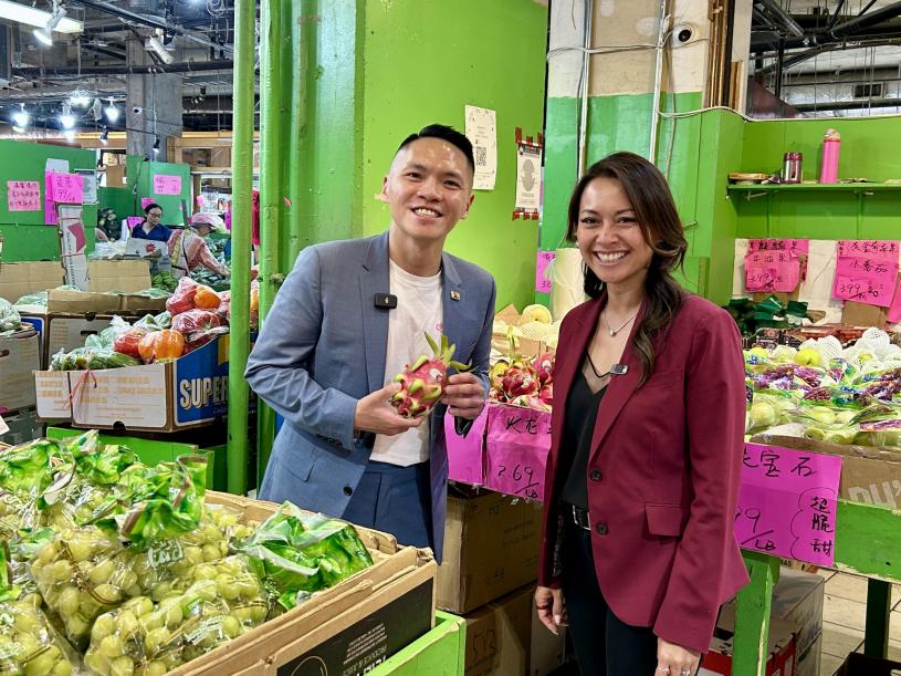 华尔迪(右)与国会议员张玮麟前往丽晶广场,大赞亚裔市场的热带水果。星岛记者黄忆欣摄