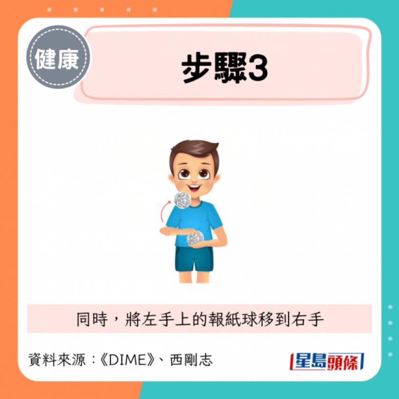 家裡沒有豆袋也不要緊,將普通報紙或廣告傳單揉成一團「紙球」即可。西剛志指,與一般豆袋相比,報紙球的手感略有不同,需要動用更多的認知功能去完成。如果覺得報紙球太輕、難以操作,建議可以先用豆袋,熟練後再嘗試用報紙球完成動作。
