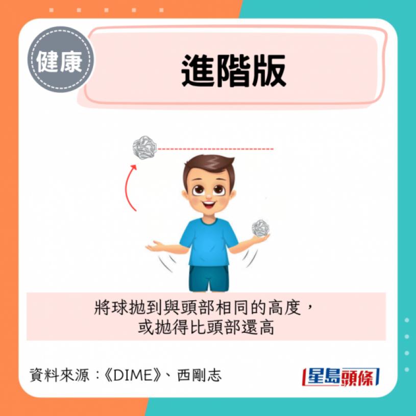將步驟1至4有節奏地重複3次。若想挑戰更難的進階版,可以在步驟2時,試著將球拋到與頭部相同的高度,或拋得比頭部還高。如果2顆報紙球已經玩得十分熟練,可以增加多1顆報紙球,即同時玩3顆。