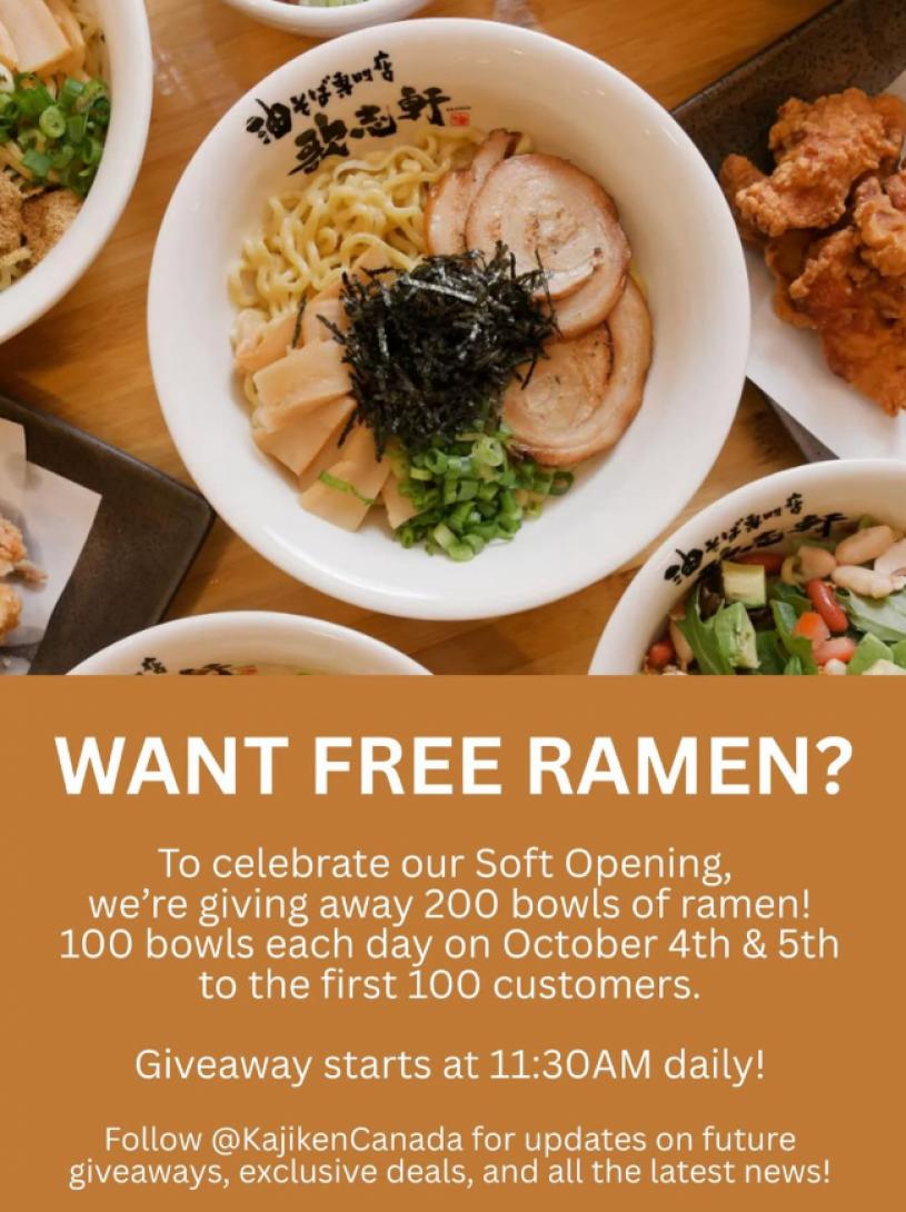 為慶祝首店開幕,加拿大歌志軒在IG宣布,10月4、5日光顧的頭100位顧客,可免費獲得招牌拉麵一碗。