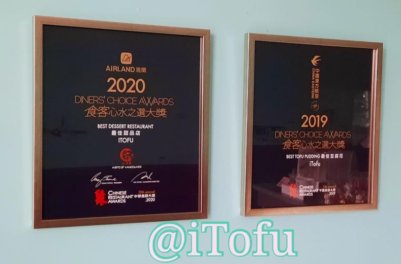 iTofu曾获温哥华“首本名菜”中华食肆大奖 (Chinese Restaurants Awards) 的2019年“最佳豆腐花”和2020年“最佳甜品店”食客心水之选大奖。
