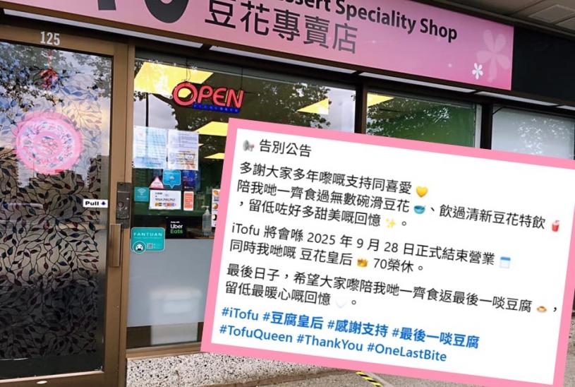 【星岛综合报道】在列治文经营了13年、曾获“最佳豆腐花”和“最佳甜品店”两奖的iTofu豆花店快将结业,店主一家希望老主顾再来帮衬一次,借此在关门前与大家话别。