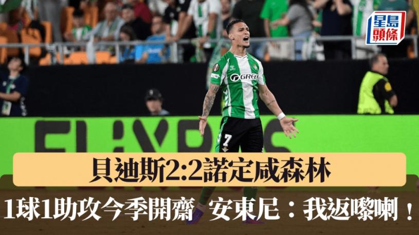 新一季歐霸周三拉開戰幔,貝迪斯在聯賽階段首輪憑鋒將安東尼馬菲奧斯(Antony)貢獻1入球、1助攻,主場2:2逼和英超諾定咸森林,搶回一分。安東尼今季在轉會市場關閉前才加盟貝迪斯,之前於曼聯只能單獨訓練,以致轉會後頭2場西甲毫無表現,今仗終於上力參與2個入球,他賽後高呼感覺和狀態已好多了,之後會越踢越好。