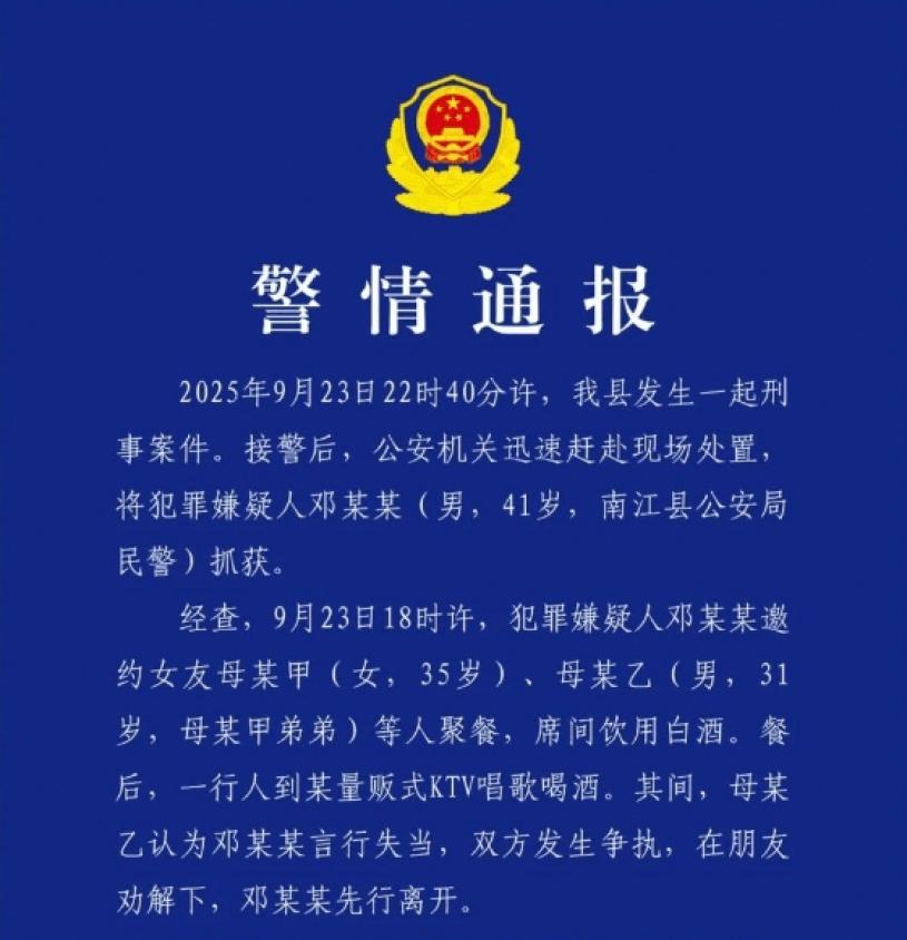 公安局通报,23日18时许,邓某某邀约女友母某甲(女,35岁)、母某乙(男,31岁,母某甲弟弟)等人聚餐,席间饮用白酒。餐后,一行人到某量贩式KTV唱歌喝酒。其间,母某乙认为邓某某言行失当,双方发生争执,在朋友劝解下,邓某某先行离开。