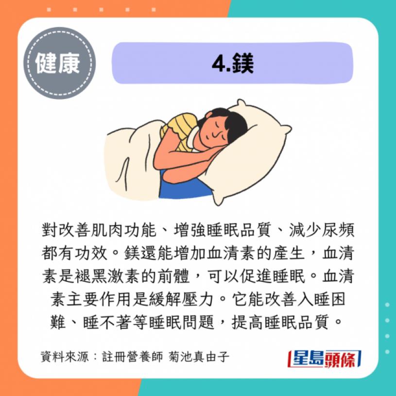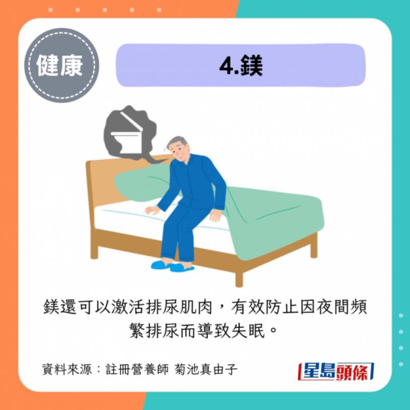 此外,鎂還能增加血清素的產生,血清素是褪黑激素的前體,主要作用是緩解壓力。它能改善入睡困難、睡不著等睡眠問題,提高睡眠品質。鎂亦可激活排尿肌肉,防止因夜間頻繁排 尿而導致失眠。