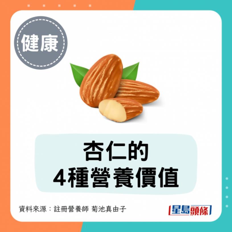 說到具保健功效的食物,一般通常會想到蛋白質含量高的肉類和魚類,以及抗氧化性能強的綠色和黃色蔬菜,但菊池真由子說,杏仁才是富含保健功效的食物。她表示,杏仁並非主要食材,所以很多人都沒有吃杏仁的習慣,但其實杏仁是一種超級食物,並具有以下4種營養價值: