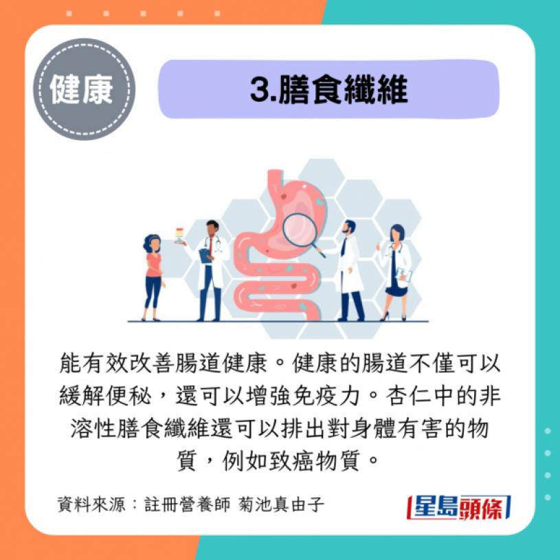 杏仁也含豐富的膳食纖維,能有效改善腸道健康。菊池說,隨著年齡增長,腸道肌肉力量會下降,令與腸道蠕動有關的自主神經系統紊亂,容易便秘。為了改善腸道健康,攝入大量的膳食纖維很重要。保持健康的腸道不僅可以緩解便秘,還可以增強免疫力。杏仁中的非溶性膳食纖維還可以排出對身體有害的物質,例如致癌物質。