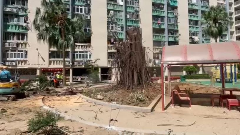 颱風樺加沙︱愛民邨老樹倒塌居民不捨 房署 : 全力搶救已讓樹身復位 冀重新長出樹葉