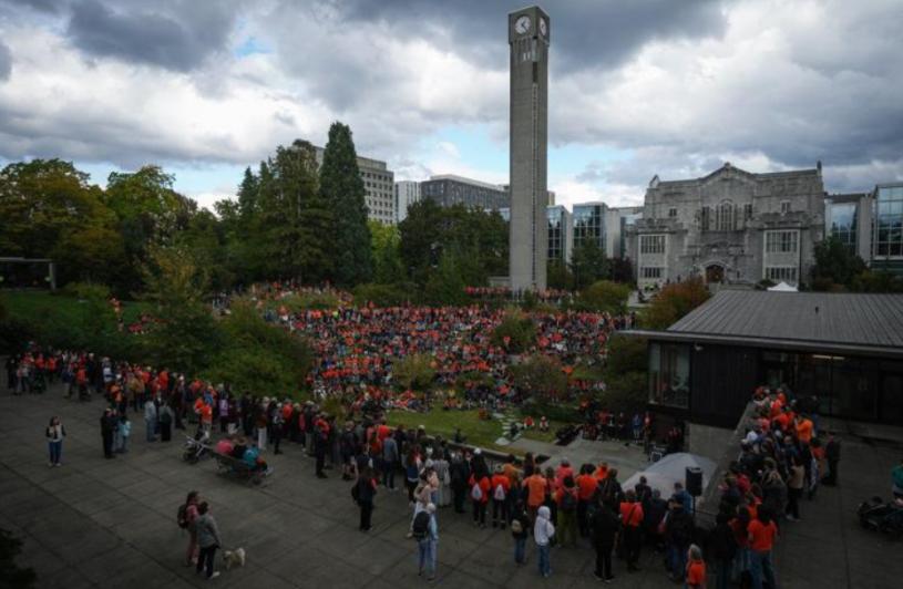 周二有數百名身穿橙色服裝的人士在溫哥華的卑詩大學(UBC)校園內舉行了跨世代步行活動,以紀念橙衫日。