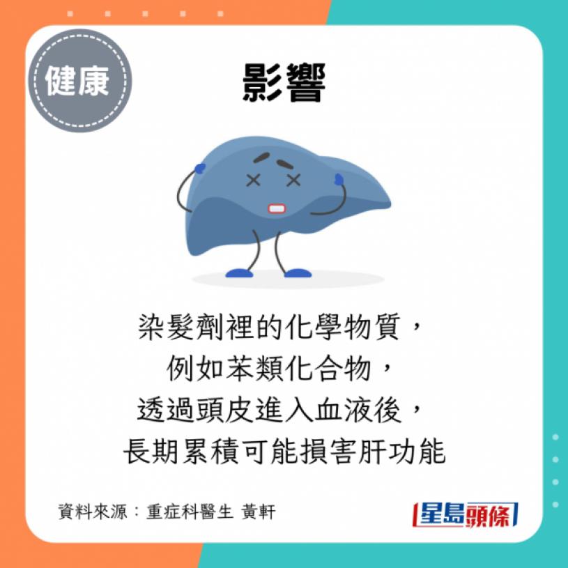 染发剂里的化学物质,例如苯类化合物,可透过头皮进入血液后,长期累积可能损害肝功能。